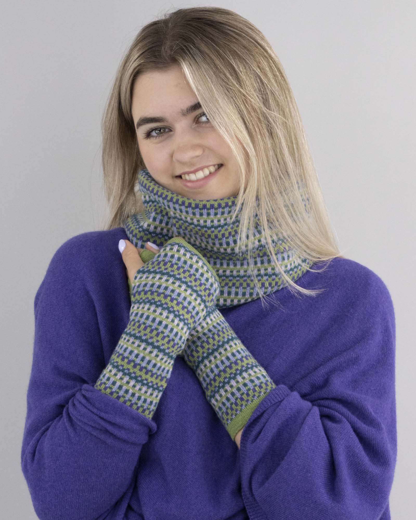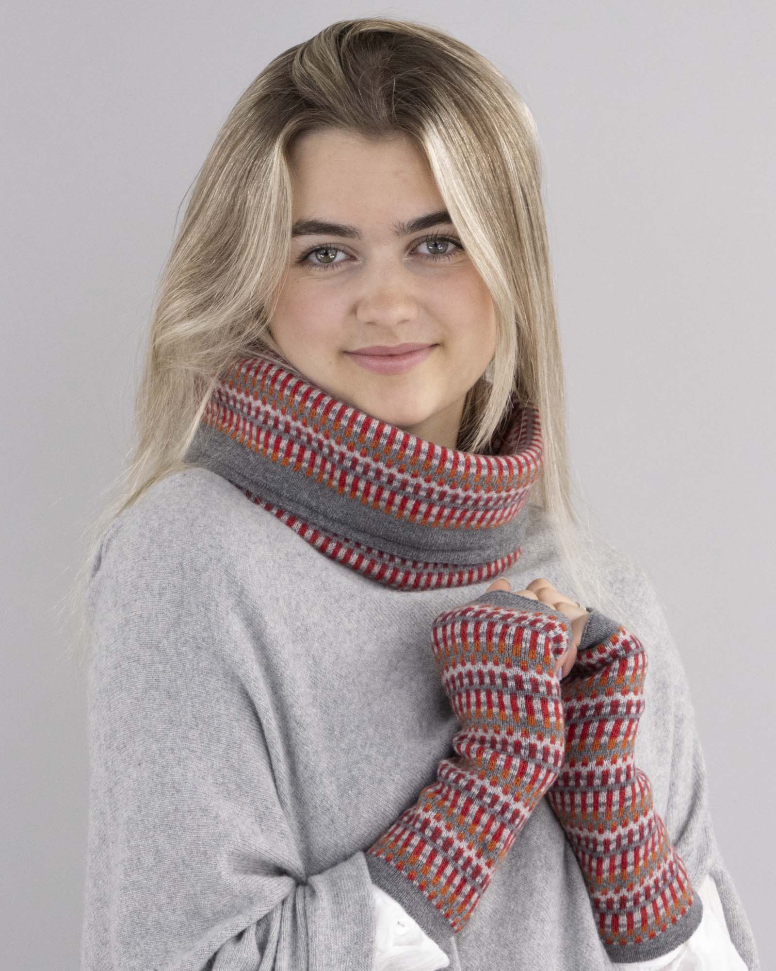 Knitted in a fine cashmere blend yarn, the Fairisle style pattern adds extra thickness for keeping out the Winter chill. These can be worn with or without using the thumb hole. The colours are so beautiful and will match up with our Classic Cashmere Blend Ponchos and Fairisle Snoods.