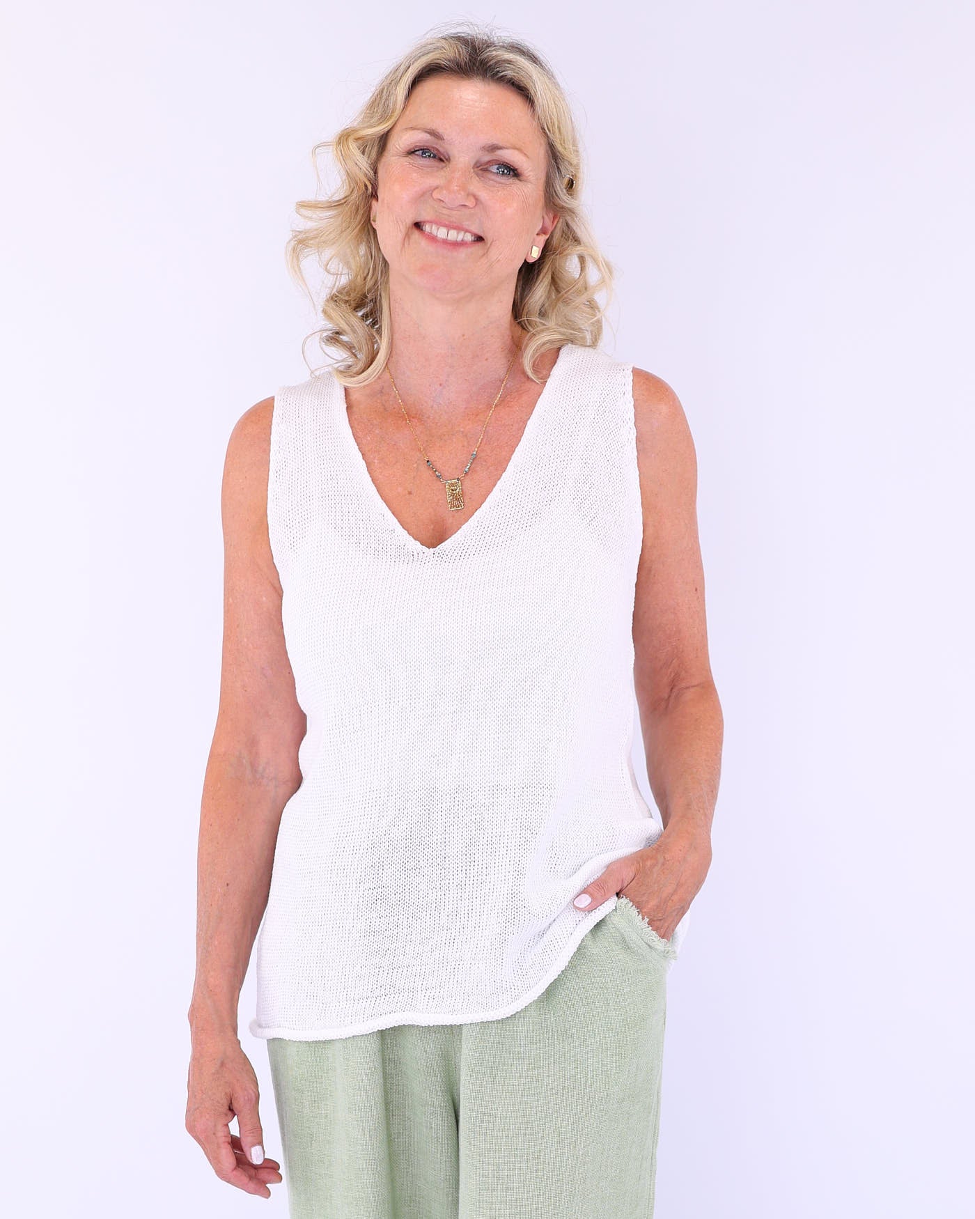 This sleeveless knitted top is a simple, stylish piece you'll reach for again and again. With a flattering V-neck and a soft rolled hem, it's an easy upgrade from your everyday T-shirt. Wear it on its own when it’s warm, or layer it under our cotton-blend loose knit tunic for a relaxed, pretty look. Lightweight and comfy, it’s perfect for holidays, evenings out, and cruise getaways! A great mix-and-match piece that adds a touch of effortless style to your summer wardrobe.