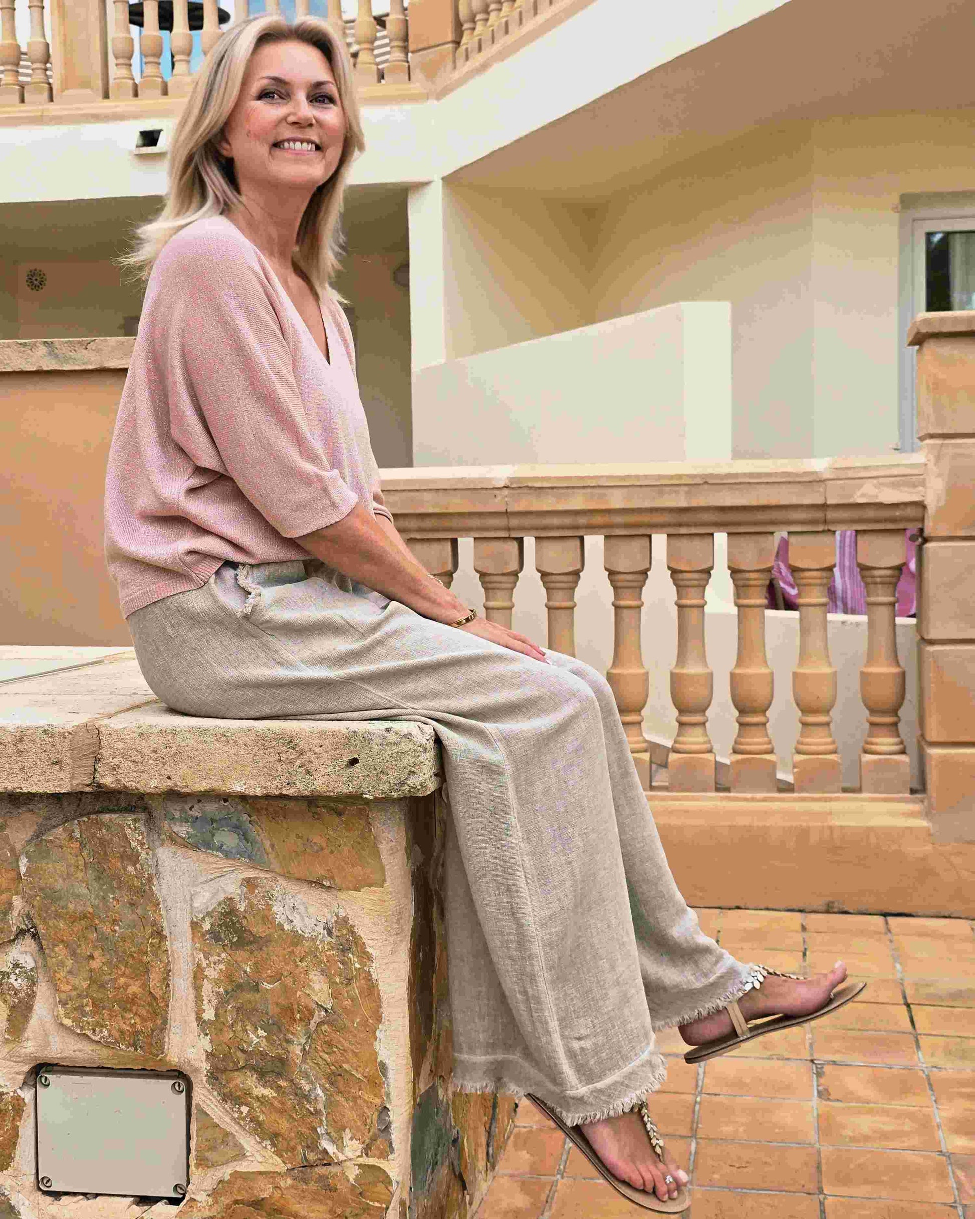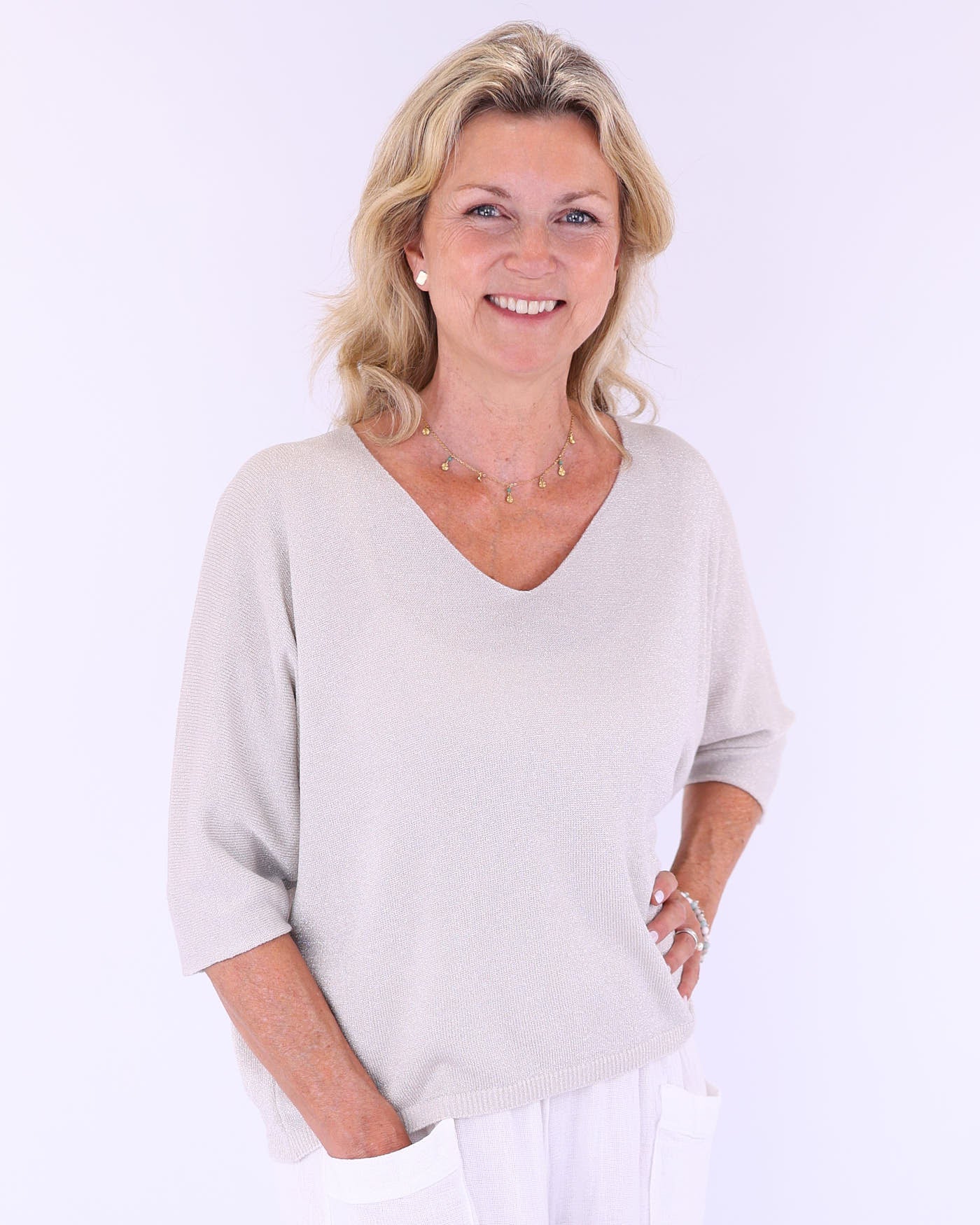 Add a touch of relaxed glamour to your wardrobe with this sparkly, elegant top. Made from a soft, draping fabric that feels lovely against the skin, it comes in a range of pretty, muted tones. It's perfect for warm nights on holiday, casual dinners, or sipping cocktails at sunset! Lightweight and flattering, it pairs beautifully with linen trousers, skirts, or your favourite white jeans—easy to wear, easy to love!